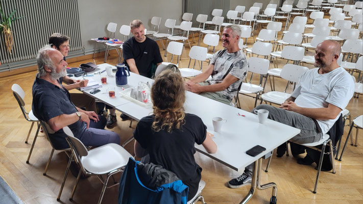 Am 9ten Juli kam es zur Auswertung der Ausstellung "Synergie: Röntgen und MUS-E". Alice Thoms, Dr. Vera Dünkel, Nadja Junginger und Paul A. Kleinert (hier von links nach rechts in der Draufsicht) tauschten sich miteinander zu Organisationsform, Inhalt, Erfolg und Defiziten der bisherigen Ausstellungen aus, besprachen künftige Umgehensweisen und die stärkere Einbettung in das an der Schule gepflogene Röntgengeschehen. Zudem gab es den gemeinsamen Schuljahresrückblick auf 2023/24 und -ausblick auf 2024/25.