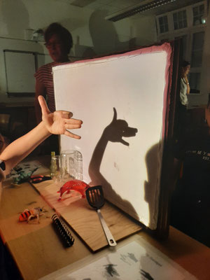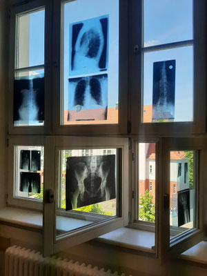 Vom 26. Februar bis 2. März 2020 waren in der „KungerKiezGalerie“ – in unmittelbarer Nachbarschaft der Schule – Schülerarbeiten und Ergebnisse des Röntgen-Projekts zu sehen. Die Ausstellung gab einen Überblick über die seit 2016 zum Thema „Röntgen“ stattfindenden Aktivitäten. Im Zentrum standen die Stationen der Projekttage „Bilder durch Röntgen“, die von Besuchern z.T. interaktiv nachempfunden werden konnten. So konnte jeder eigene Schattenkompositionen erschaffen oder Porträtsilhouetten zeichnen und damit ein Stück weit den Prozess und die Faszination des „Durchleuchtens“ mit Röntgenstrahlen nachvollziehen.