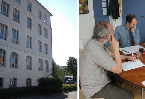 Am 6. Oktober traf sich die Projektgruppe (Prisca Schrickel, Dr. Vera Dünkel, Michael Schlecker, Dr. Vanessa Casagrande und Paul A. Kleinert - von rechts nach links in der Draufsicht) an der Röntgenschule, um die Strukturplanung für das künftige Geschehen zu bedenken.